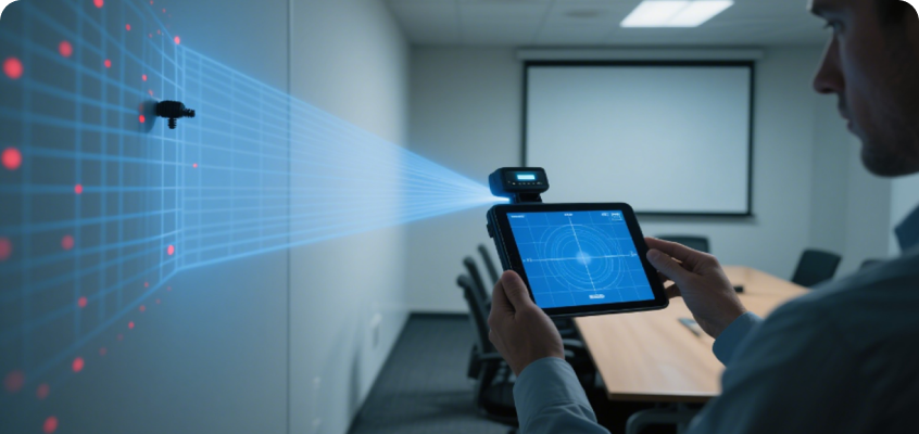 检测会议室、办公室、住所等重点区域,重点排查隐藏摄像头、录音设备及无线窃听等窃密装置。